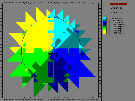 Figure 7.15: Interpolated aspect data calculated when the large and small concentric circles were defined as having an elevation of 10 and 100 metres respectively. The two circular contour lines are shown as line features.