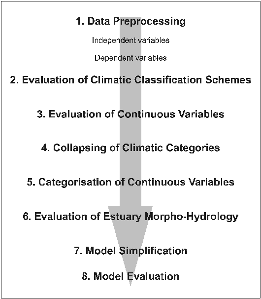 The final model integrates as many physical variables as possible whilst keeping the number of categories to a useable minimum. The resultant scheme places Australian estuaries into 11 out of 15 possible categories. The categories are defined by two terms; a modified version of the Bureau of Meteorology's 1998 climatic zones, and extreme tidal range. The proportion of total estuarine area that is intertidal can be used to further divide moderate and high tide range estuaries. These data are contained in the Australian Estuarine Database for all major estuaries in Australia and are easily obtainable for any small estuaries that are not already in the database.
