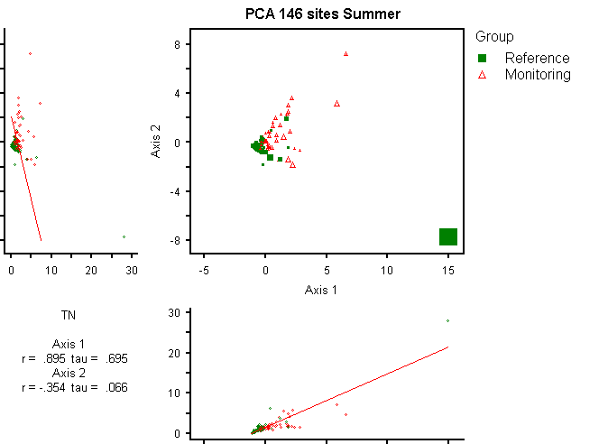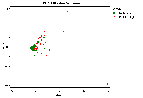 Out of more than 200 species of diatoms recorded from the sampling sites, 57 species selected on the basis of their relative frequencies, were used for the classification of the sites to show the similarity in the distribution pattern of diatoms. Diatom assemblages with similar ecological preferences were clustered together. Discriminant function analysis showed that there was a high degree of concordance between the two classifications. Multi-dimensional Scaling (MDS) was employed for ordination of sites based on diatom assemblages. Environmental variables were related to the ordination with principal axis correlation. Stream conditions such as water table depth and percentage of native vegetation had significant correlation with pristine sites, where as, alkalinity, electrical conductivity, ground water salinity, catchment land use, riparian damage and colour had significant correlation coefficients with the impacted sites. The distribution pattern of diatoms were separated into three distinct groups: Reference, Monitoring and Intermediate – within the intermediate group, the brackish sites were further separated. Several indicator species were recognised on the basis of the correlation of the species to the sites.